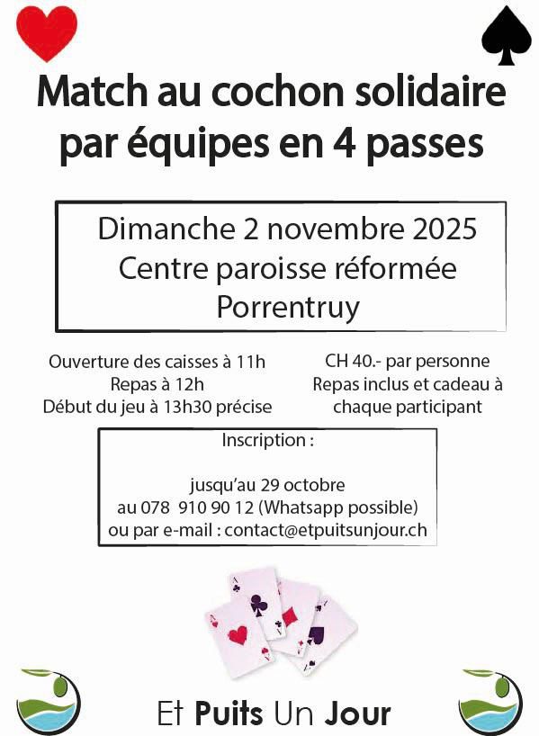 Pour celles et ceux qui l’ont manqué, pas d’inquiétude : vous pouvez vous rattraper en participant à la deuxième édition de notre fameux match au cochon ! Une belle soirée vous attend, avec une organisation aux petits oignons et une ambiance garantie. Ce serait dommage de manquer cet événement convivial ! Alors n’hésitez plus : venez passer une superbe soirée de cartes à la salle paroissiale réformée de Porrentruy.